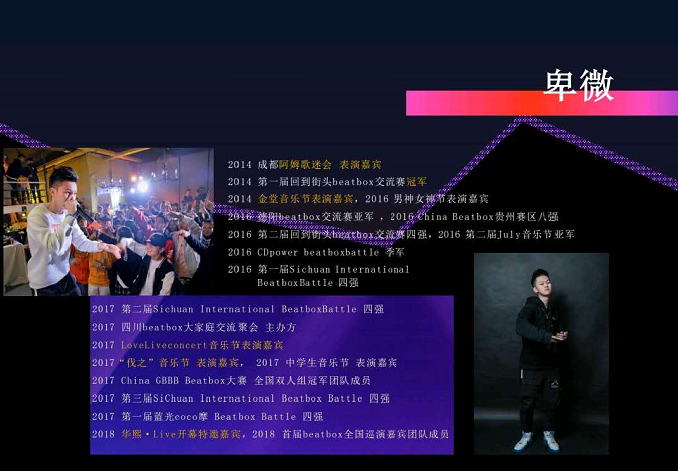 ChinaYMT厂牌成员,2014成都回到街头beatbox大赛冠军,2017第三届四川国际beatbox battle 四强,2017“伐之”音乐节表演嘉宾。